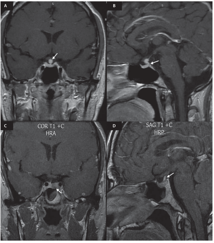 Los hallazgos característicos en la IRM cerebral son la hiperintensidad homogénea de la hipófisis anterior, con aumento del volumen hipofisario de predominio supraselar e hiperintensidad de la duramadre adyacente (signo del tallo dural). En caso de infundibulitis, se puede observar hiperintensidad con apariencia pseudotriangular del infundíbulo y pérdida de la hiperintensidad de la hipófisis posterior en T1 cuando se asocia con diabetes insípida [3, 16, 17], tal como se describe en los dos presentes casos. Estos signos son más frecuentes en la hipofisitis linfocítica clásica. El compromiso aislado del tallo hipofisario es más común en la hipofisitis linfocítica, histiocitosis de Langerhans, tumores de células germinales o metástasis [18]. Los hallazgos de silla turca vacía pueden encontrarse como resultado del proceso inflamatorio crónico.