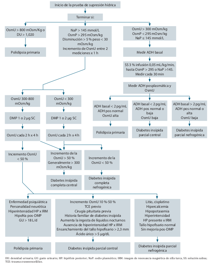 La diabetes insípida es considerada una enfermedad poco frecuente con una prevalencia de 1:25 000 personas [1]. Existen múltiples condiciones que afectan la neurohipófisis o el hipotálamo y generan una síntesis deficiente de hormona antidiurética (ADH) [5]. El diagnóstico se puede realizar de acuerdo con los siguientes contextos clínicos: si hay evidencia de hipernatremia, es suficiente con observar un incremento del 50 % de la osmolalidad urinaria con una prueba de desmopresina subcutánea (1 mg). En caso de normonatremia, la prueba de restricción hídrica realizada de forma intrahospitalaria es la más utilizada y tiene en cuenta la capacidad fisiológica de concentrar la orina y la respuesta con el uso de desmopresina. Esta prueba fue la que se le realizó a la paciente 1. En la Figura 2 se incluye el algoritmo de interpretación utilizado por nuestro servicio para la realización de la prueba de restricción hídrica.