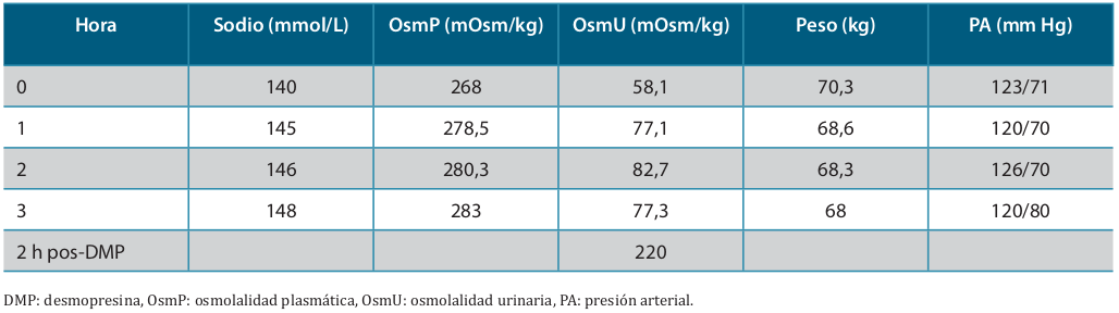 Se realizó una prueba de restricción hídrica (Tabla 1), cuando presentó hipernatremia (148 mmol/L), se suspendió la prueba y se administró desmopresina 1 g subcutánea (SC) con aumento de osmolalidad urinaria hasta 220 mOsm/kg (150 % por encima del valor basal). De acuerdo con estos hallazgos, se consideró una diabetes insípida de origen central completa.