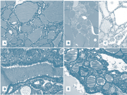 Figura 3.: A) folículos tiroideos con coloide que pueden teñirse tanto acidófilos como basófilos, B) el coloide es positivo a la tinción de PAS, C) al azul alcián, D) en glándulas activas se pueden observar vacuolas de reabsorción entre el coloide y la región apical de las células foliculares, E) tinción de Masson, donde se observan láminas delgadas de colágena (color azul) entre los folículos.