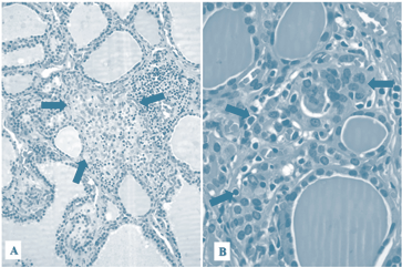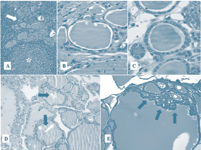 Figura 4: A)Células de Hürthle u oncocitos (flecha) en un caso de tiroiditis de Hashimoto, B) epitelio folicular plano simple, C) epitelio folicular cúbico/cilíndrico simple, D) cristales de oxalato de calcio (weddelitta) flechas, E) “cojinetes de Sanderson-Damberg” (flechas) Nota explicativa: figura A) nótese la presencia de un folículo linfoide (*).