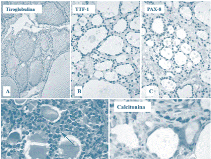 Por inmunohistoquímica, las células foliculares expresan tiroglobulina y el receptor para tirotropina, que son probablemente los marcadores más específicos del epitelio folicular tiroideo (figuras 5A,B y C). Además, hay expresión nuclear de TTF-1 (factor de transcripción tiroideo 1 y PAX 8, y citoplásmica de diversas citoqueratinas como CK 7, CK18, CK19, CAM5.2 y 34βE11. El antígeno epitelial de membrana (EMA), diversas claudinas, el EGFR (receptor del factor de crecimiento epidérmico), la vimentina y los receptores de estrógenos β, igualmente suelen ser positivos (1).