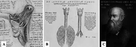 Figura 1: : A) dibujo de Leonardo da Vinci que ilustra la laringe y la glándula tiroides formada por dos lóbulos, B) boceto anatómico de la glándula tiroides, dibujando en el libro de anatomía de Andreas Vesalius de 1543 Andreae Vesalii Bruxellensis De humani corporis fabrica libri septem. Basileæ: Ex officina Ioannis Oporini, C) Mateo Realdo Colombo (Realdus Columbus) (1516-1559) Nota explicativa:figuraA: es posible que este dibujo corresponda a la primera representación de la glándula tiroides y probablemente sea una tiroides no humana.