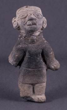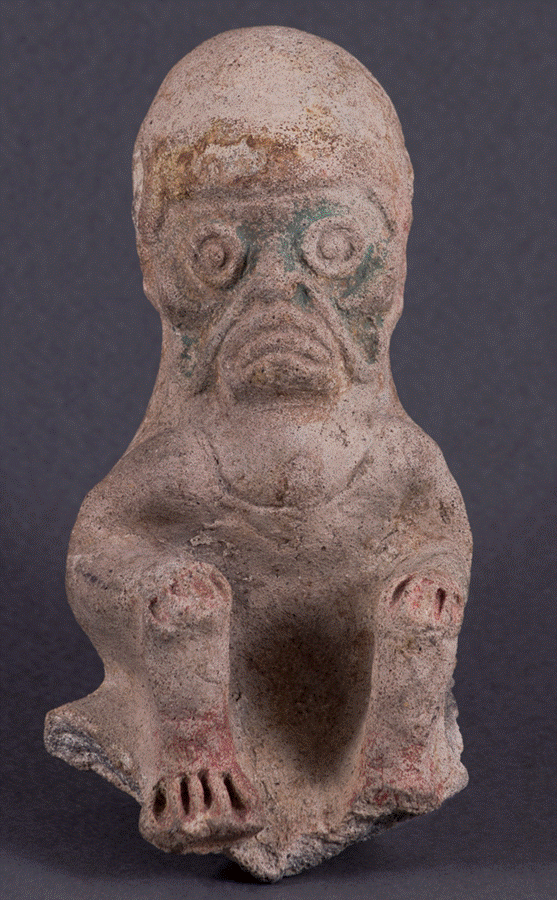 El primer caso que se muestra corresponde a una figurina en cerámica de la cultura Tumaco-La Tolita de 11 cm de alto, 6 cm de ancho y 5 cm de profundidad, que representa a un sujeto en posición sedente, con un gesto de aburrimiento, expresado con sus comisuras labiales hacia abajo y unos ojos muy abiertos, quien deja ver en su región anterior del cuello un importante crecimiento del tiroides, compatible con un cuadro de bocio (figura 1).