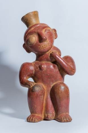La quinta cerámica (figura 5) pertenece al parecer a la cultura ecuatoriana Jama Coaque que, a diferencia de la cultura Tulato, gusta de mostrar un contraste entre los atuendos, arreglos, adornos y el propio cuerpo de la persona (4), p74-81. La cerámica muestra un cuerpo completo parado de pies, con una importante restauración que le imprime un color claro, y sin el engobe y brillo en parte del pecho, espalda y nalgas, un rasgo que sí tiene el resto de la cerámica. Esta, que mide 17 cm de alto, 8,5 cm de ancho y 7,5 cm de profundidad, muestra un tocado dotado de siete puntas que le cubre las orejas, así como un gran collar que va de hombro a hombro. La mano izquierda reposa en la parte latero-anterior izquierda del tocado, mientras lleva el miembro superior derecho hasta la parte izquierda del tronco, y, allí, con la mano ipsilateral sostiene apoyado en el piso un bordón. El rostro del personaje tiene la boca abierta y al parecer los ojos cerrados. El personaje presenta un doble falo o difalia. Con el propósito de ilustrar esta anomalía tan infrecuente, se ofrece una impronta hecha en cera, a tamaño natural, correspondiente a un caso de difalia completa (figura 6).