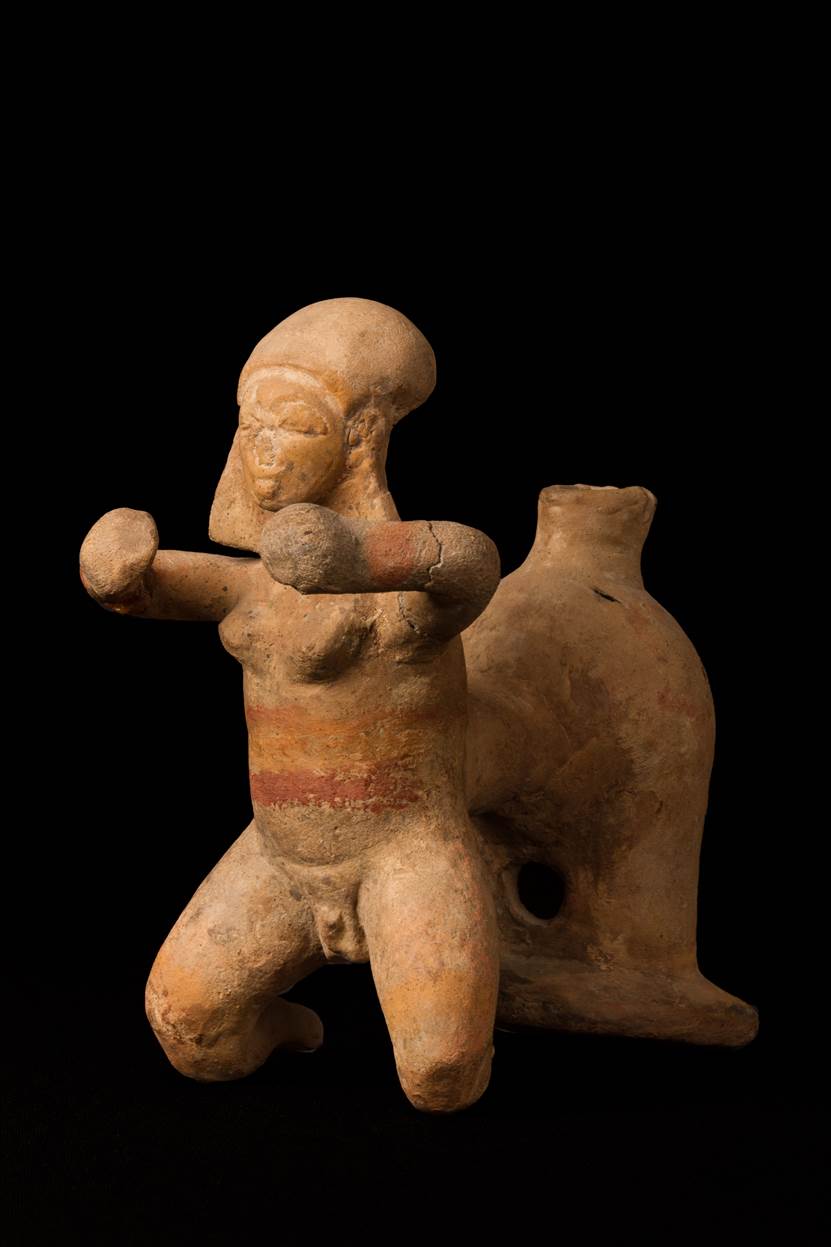 La cuarta cerámica es un recipiente, que pertenece a la cultura Tumaco-La Tolita o Tulato, de 19 cm de alto, 12 cm de ancho y 9,5 cm de profundidad. Está compuesta de dos partes: la delantera, representada en una figura humana, y la posterior, representada en un recipiente que está unido a la figura humana a la altura de la espalda por un puente. La parte de la cerámica correspondiente al tronco del cuerpo humano tiene cuatro colores: terracota o crema, rojo tenue, amarillo y rojo intenso; a la altura de las muñecas, dos: crema y rojo, y en el tercio inferior de los muslos, dos: crema y amarillo. El personaje está hincado con las rodillas y tiene las extremidades superiores levantadas a la altura de los hombros, en una actitud de sostener algo con las manos. El rostro, por desgaste de la cerámica, no tiene bien definida la nariz, pero muestra con claridad una deformación intencional del cráneo tubular oblicua con ensanchamiento a la altura de la parte posterior de los parietales. La estatuilla muestra senos y genitales masculinos. En esta cerámica, al igual que en la mayoría de las producidas por la cultura Tulato, y a diferencia de las cerámicas elaboradas por otras culturas prehispánicas, la silueta humana cobra vida, deja de ser estática y hace énfasis en las proporciones anatómicas (4). La figura 4 parece corresponder a un síndrome de Klinefelter o a un caso de ginecomastia.