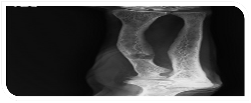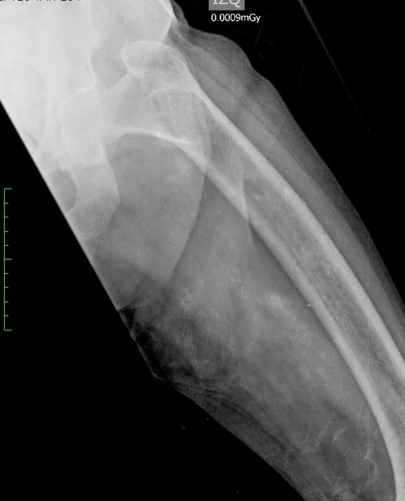Figura 1: Radiografía de fémur. Fractura a nivel intertrocantérico izquierdo con ascenso de la diáfisis femoral, cambios por osteoporosis y lesiones osteolíticas. Ampliación con TAC reporta fractura intracapsular de fémur izquierdo, que sugiere proceso atípico.