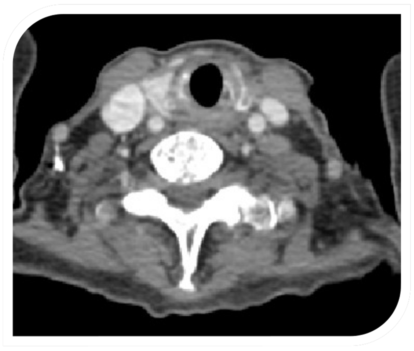 Figura 3: TAC contrastado de cuello. Nódulo tiroideo izquierdo de alto riesgo. Biopsia reporta: nódulo sólido tiroideo izquierdo, lesión folicular oncocítica con gruesa capa de tejido conjuntivo denso que presenta algunas calcificaciones, no se aprecia invasión vascular o perineural.