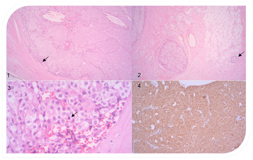 Figura 4: Patología. Tumor de configuración nodular constituido por grupos expansivos y trabéculas gruesas de células amplias de citoplasma eosinófilo pálido con núcleos de tamaño intermedio, algunos hipercromáticos con nucléolos evidentes y ligera atipia. La neoplasia posee estroma fibrovascular y está rodeada por cápsula fibrosa gruesa en la que hay implantes de tamaño variable del tumor que comprometen focalmente los tejidos blandos adyacentes. Fotografías: 1. Cápsula fibrosa; 2. Invasión focal del tejido blando; 3. Anisonucleosis y figura mitótica; 4. Inmunohistoquímica para PTH++. IHQ también fue positivo para cromogranina++, calcitonina+, Ki67 10 %. Negativo para CK19, TTF1, tiroglobulina, proteína S100, CD10 y CEA.