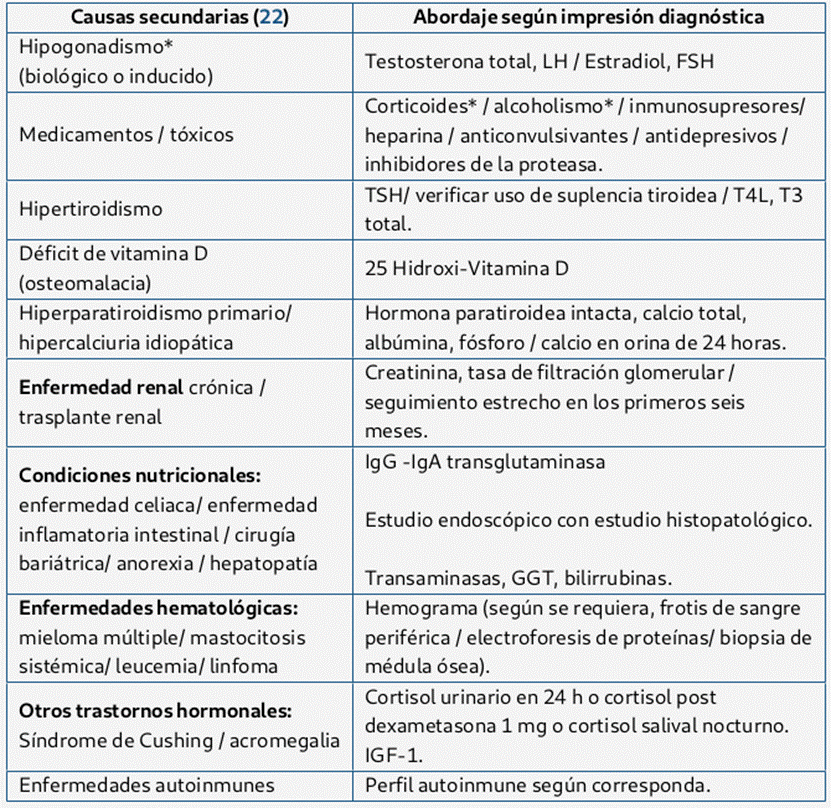 Tabla 2: Diagnóstico diferencial de osteoporosis secundaria y su enfoque inicial.