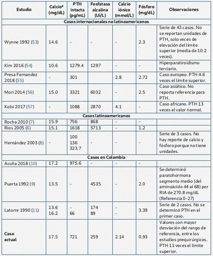 La tabla se presenta con énfasis regional y nacional. Se buscaron casos y series de casos mediante PubMed, BIREME-Lilacs y Google Escolar, con los términos MeSH y DeCS correspondientes: carcinoma, parathyroid OR parathyroid neoplasm. Se preferían series de casos, en su defecto se seleccionaron los casos que tuvieran los valores bioquímicos del perfil fosfocálcico.