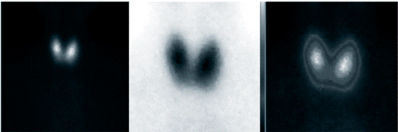 Figura 3: Gammagrafía nuclear de tiroides Nota explicativa de la imagen: se observa un aumento de tamaño, una captación uniforme del radiofármaco y los hallazgos compatibles con bocio hipercaptante.