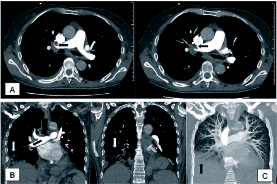 Figuras 2: AngioTAC de vasos de tórax Nota explicativa por imagen: (A) ventana angiográfica horizontal donde se observa el compromiso trombótico de la arteria pulmonar derecha; (B) ventana angiográfica frontal donde se observa la presencia de material trombótico que ocluye el flujo de la arteria pulmonar derecha y de su rama al lóbulo inferior derecho, además de infarto pulmonar en segmento posterior de lóbulo inferior derecho; (C) ventana de vasos pulmonares donde se observa el defecto de paso de medio de contraste a vasos pulmonares de lóbulo inferior derecho.