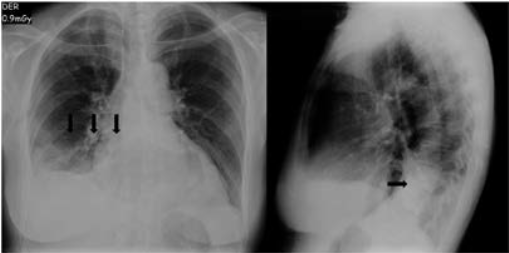Figura 1: Rx de tórax en proyecciones PA y lateral Nota explicativa de la imagen: se destaca la pérdida de ángulo costo-diafragmático derecho en relación con radio-opacidad que compromete el lóbulo inferior derecho, la cual igualmente genera pérdida de la radio-lucidez retrocardiaca.