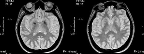 Figura 2: Resonancia magnética de encéfalo. Nota aclaratoria: imagen de susceptibilidad magnética, donde se evidencia la ausencia de sangrado, por lo que los hallazgos en T1, aunque son hiperintensos, no corresponden a sangrado y son compatibles con depósitos de calcio.