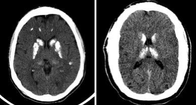 Figura 3: Tomografía de cráneo simple. Nota aclaratoria: se identifican múltiples calcificaciones ganglio-basales bilaterales comprometiendo el putamen, el núcleo caudado, los lóbulos frontales, los parietales, pero sin compromiso del cerebelo. El mesencéfalo, el sistema ventricular y el tallo estaban normales