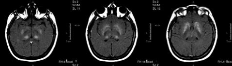 Figura 1: Resonancia magnética de encéfalo. Nota aclaratoria: corte axial, imagen potenciada en T1. Están marcadas las áreas hiperintensas que comprometen ganglios de la base, tálamo y coronas radiadas en forma bilateral