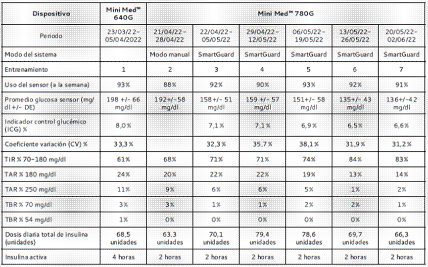 Al comparar las métricas del sistema Mini Med™ 640G vs. Mini Med™ 780G, el TIR aumentó del 61 % al 68 % en las primeras dos semanas de entrenamiento; con el inicio del modo SmartGuard™, este incrementó del 68 % al 71 % y al mes y medio, aproximadamente de uso del sistema Mini Med™ 780G, el TIR final fue de 83 %, sin hipoglucemias severas, con un uso óptimo del dispositivo y una aceptación de la nueva tecnología por parte del paciente.