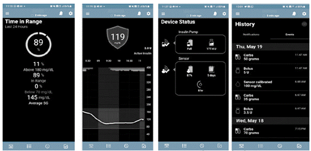 Figura 1: Imágenes tomadas del smartphone del paciente sobre parámetros de control glucémico e información sobre uso del dispositivo Mini Med™ 780G durante la primera semana de activada la función SmartGuard™