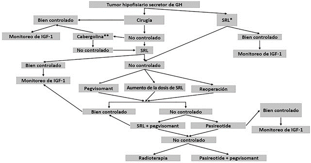 La cabergolina como monoterapia se ha informado que normaliza el IGF-1 en un 20- 30 % de los pacientes y se ha reportado que la adición de 10 mg de pegvisomant al día durante 12 semanas logró normalizar la IGF-1 en el 68 % de los casos (72).