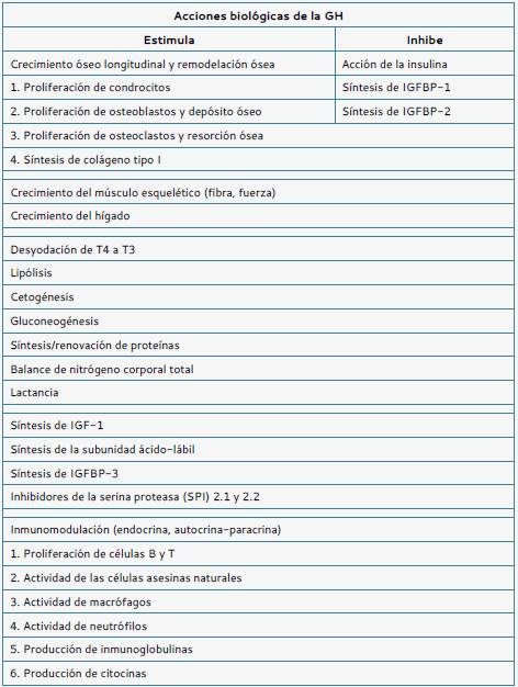 Son diversas las funciones fisiológicas de la GH. En la tabla 1 se describen las acciones biológicas de la GH y en la figura 1 se describe los mecanismos fisiológicos de GH/IGF-1 (18).