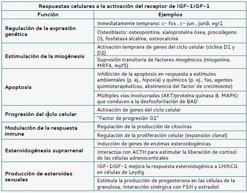 IGF-1 también es importante en el desarrollo fetal, el crecimiento adolescente y la homeostasis del tejido adulto, regula el metabolismo de la glucosa y los lípidos (38). Algunos ejemplos relevantes de la respuesta celular a la activación del receptor de IGF-1 se describen en la tabla 2.