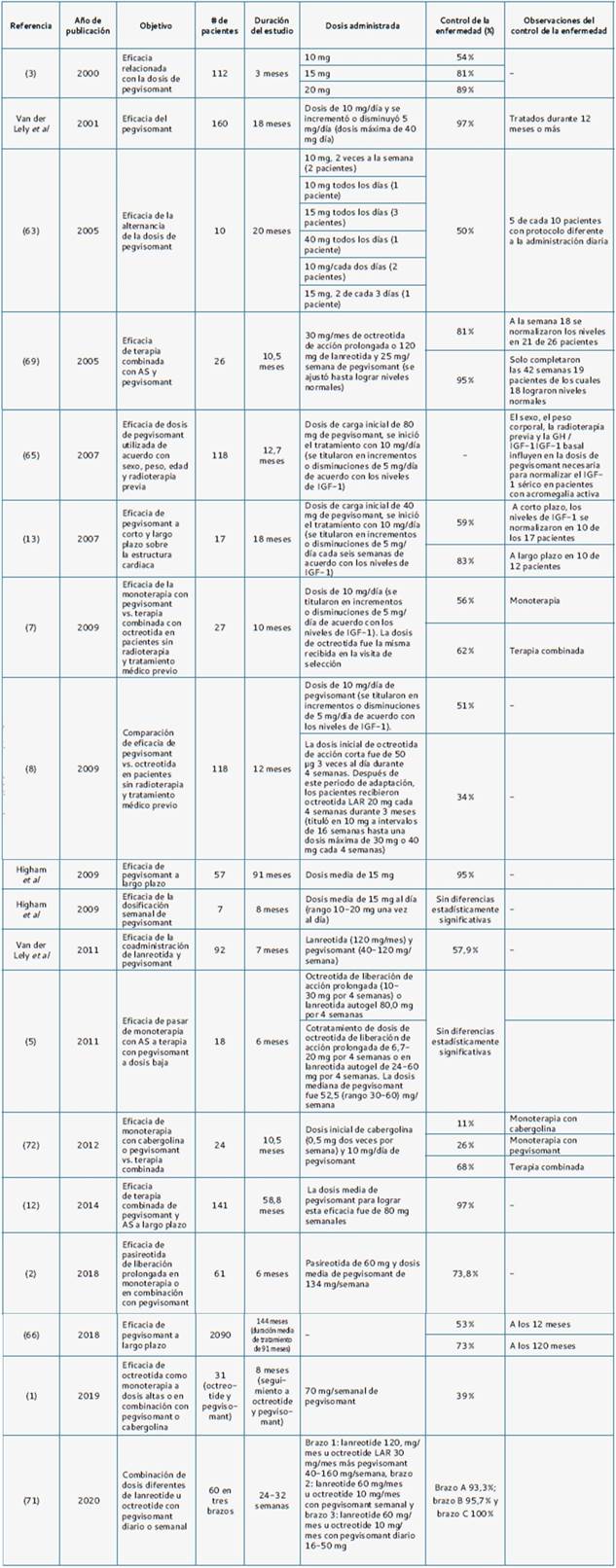 Un metaanálisis reciente de estudios observacionales longitudinales evaluó la eficacia y la seguridad de pegvisomant. Se incluyeron 31 artículos con los cuales se realizaron ocho metaanálisis (dos sobre efectividad y seis sobre seguridad). La tasa global del control de la enfermedad fue del 60,9 %, pero cuando se consideró solo a los pacientes sometidos a monoterapia (cinco estudios), se encontró una tasa de control de IGF-1 global del 71,7 % (4).