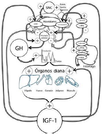 IGF-1 regula la producción de GH a través de un circuito de retroalimentación negativa (38) debido a que los niveles elevados de GH e IGF-1 en la circulación estimulan la liberación de somatostatina que interactúa con los receptores de somatostatina y regula negativamente la secreción de GH de la pituitaria anterior (15, 36). La concentración sérica de IGF-1 refleja la secreción de GH de 24 horas y el envejecimiento se asocia con una disminución de la producción de GH e IGF-1 (17) (figura 1).