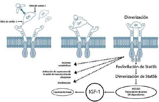 Una vez liberada la GH, la transducción de señales se inicia con la unión de GH a un receptor de GH (GHR) en la membrana plasmática de los tejidos diana (figura 2) (28). El gen GHR se encuentra en el brazo corto del cromosoma 5 (19), este receptor transmembrana es miembro de la superfamilia de moléculas de citoquinas tipo 1 (20, 23) y se compone de aproximadamente 620 aminoácidos (19), este se encuentra en diferentes tejidos como hígado, tejido adiposo, músculo, próstata, riñón, placenta, corazón, cerebro y glándula mamaria (21, 27).