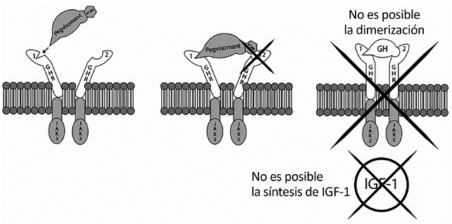 El pegvisomant se une al sitio de unión 1 del GHR, pero no tiene la capacidad para unirse al sitio 2, evitando así la fosforilación de Jak2 y transducción de señales (figura 3), esto se traduce en un bloqueo de la unión GH-GHR, una disminución del IGF-1 (así como de otras proteínas séricas que responden a la GH) (26, 29, 54) y a un aumento de la secreción de GH por la retroalimentación IGF-1 reducida, es decir, decrece la acción de GH en lugar de inhibir su