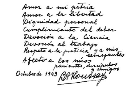 Aunque una amnistía lo reincorporó a su cargo docente en la UBA en 1945, un año después y con el ascenso a la presidencia del coronel Juan Domingo Perón, fue jubilado por decreto. El gobierno de Perón fustigó y persiguió a Houssay durante todos los años de su mandato (1946- 1955). Incluso, cuando él obtuvo el Premio Nobel de Medicina y Fisiología en 1947, se ordenó guardar silencio oficial en la Argentina y, de hecho, periodistas de la cuerda del dictador lo acusaron de elitista, soberbio, enemigo de las clases populares y de que había desconocido el trabajo de sus colaboradores al ser premiado (15, 16). El valor civil y la valentía demostrados por Houssay en estos años fue inmenso y desde su destitución, en 1943, tenía enmarcado en su estudio un breve escrito que denominó “Mi credo personal” (figura 1) y que lo supo difundir también de manera pública (17):