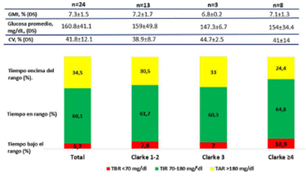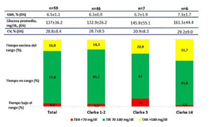 se incluyeron 83 pacientes (mediana de edad 63 años (RIC 53.5-70.5), 71.1% DM2, HbA1c 7.6±1.6%). La mediana de tiempo en rango (TIR70-180 mg/dL) fue 75% (RIC 63-92), tiempo debajo rango (TBR<70 mg/dL) 3% (1-7), y tiempo sobre el rango (TAR>180 mg/dL 15% (3-27). En pacientes con Clarke ≥4 el %TIR fue menor (Mediana 55(RIC 41-89) vs 77(RIC 68-92), p=0.05) a expensas de mayor %TAR (Mediana 23(RIC 7-54) vs 15(RIC 3-16), p=0.15). No se encontraron diferencias significativas en %TBR<70mg/dl.
