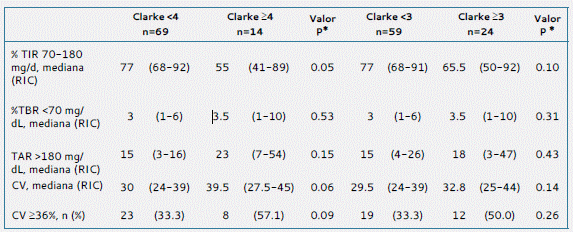 Por otra parte, los pacientes con puntaje de Clarke <4 lograron mayor %TIR 70-180 mg/ dl comparado con los sujetos con Clarke ≥4 (Mediana 77 (RIC 68-92) vs 55 (RIC 41-89), p=0.05)) (tabla 2) a expensas de menor TAR >180 mg/dL (Mediana 15 (RIC 3-16) vs 23 (RIC 7-54), p=0.15). Dichas diferencias fueron más evidentes en los pacientes con diabetes tipo 2, que en los pacientes con diabetes tipo 1 (figura 2 y 3).