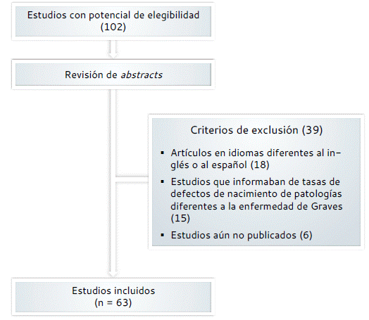 Se investigó en las bases de datos electrónicas PubMed, Lilacs y Scielo, incluyendo los términos MESH: Pregnancy Methimazole, Carbimazole, propylthiouracil, congenital or abnormality, congenital or birth defect or congenital malformation, Thyroid orbitopathy y Graves’ disease, para hacer la búsqueda de la literatura publicada entre los años 2000 y 2022 y se incluyeron artículos en inglés y español. Debido al dilema ético que supone realizar ensayos clínicos aleatorizados, solo se disponen de estudios observacionales, por tanto, se seleccionaron estudios de cohorte prospectivos o retrospectivos que informaban las estimaciones de la asociación entre los ATD y los defectos de nacimiento en (1) un grupo expuesto a CMZ/MMI, PTU o ambos fármacos (grupo de exposición); (2) un grupo de control de mujeres sin hipertiroidismo o exposición a ATD en el embarazo (grupo de control) y (3) mujeres con hipertiroidismo que no recibieron tratamiento con ATD en el embarazo (grupo de enfermedad no tratada). Asimismo, se excluyeron los estudios que informaban de las tasas de defectos de nacimiento con otras patologías diferentes a enfermedad de Graves y con uso de medicamentos diferentes a CMZ/MMI y PTU.