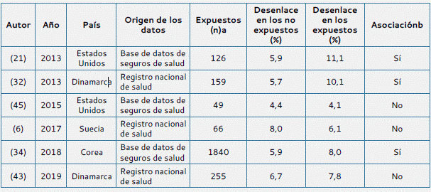 Notas aclaratorias: a: número de niños expuestos tanto al metimazol como al propiltiouracilo en las primeras 12 semanas de embarazo y b: indica si se observó una asociación entre la exposición a metimazol y propiltiouracilo y los defectos de nacimiento. Fuente: adaptado de (43)