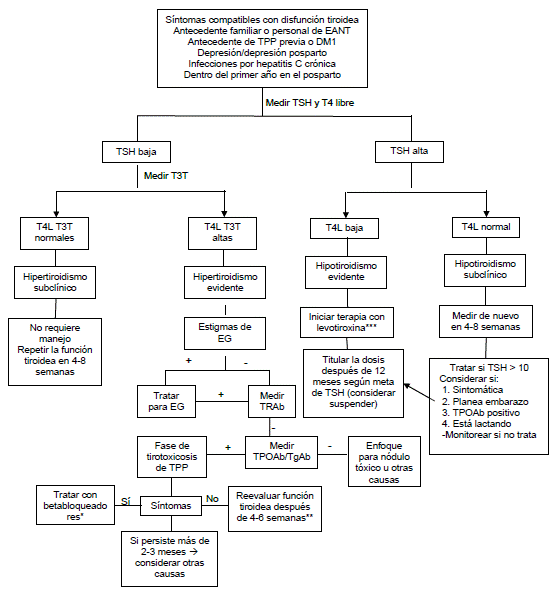 Los síntomas clásicos de la TPP durante la fase hipo e hipertiroidea pueden ser sutiles y únicamente reconocidos de manera retrospectiva (15), por lo cual, se han estudiado varios enfoques costo-efectivos que permitan determinar, en las mujeres, el riesgo de TPP, entre estos está el interrogatorio de tres preguntas, que consiste en conocer: la presencia de enfermedad autoinmune no tiroidea (EANT) en la mujer; EANT en al menos un familiar y enfermedad tiroidea en al menos un familiar. La ausencia de este historial o la presencia únicamente de historia personal de EANT significa que una paciente tiene menos de un 10 % de riesgo de desarrollar TPP, mientras que la presencia de los tres antecedentes o la evidencia tanto de historia personal como familiar de EANT presenta un riesgo de 80-100 % de TPP (16). Vale destacar que la guía de la American Thyroid Association (ATA), de manejo de hipotiroidismo del 2012 (17), recomienda hacer tamización en todas las pacientes con depresión, incluyendo depresión posparto (3). También se ha recomendado el monitoreo de la función tiroidea entre quienes hayan presentado algún episodio previo de TPP, TPOAb positivos antes del embarazo, DM1, hepatitis C, otras EANT, historia de EG, dificultad para lactar, uso de levotiroxina (18) y antecedentes de aborto (5).