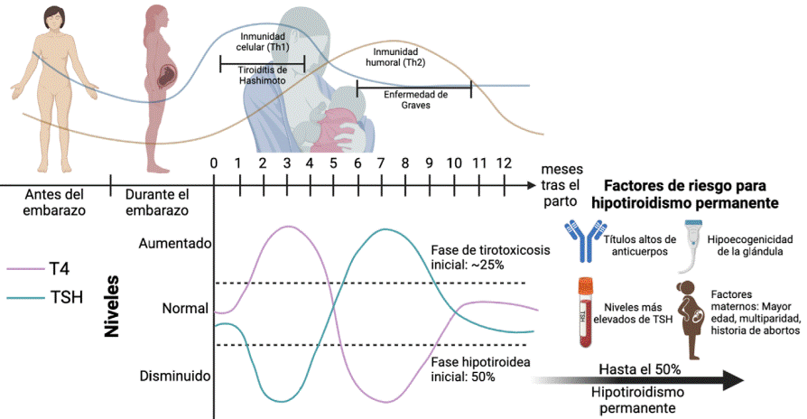 La TPP tiene una base autoinmune que hace que las mujeres con anticuerpos antiperoxidasa (TPOAb) tengan seis veces más riesgo de desarrollarla y que sea, por tanto, tres veces más frecuente entre quienes tienen diabetes tipo 1 (DM1), lo cual hace que en estos dos grupos se recomiende el cribado para disfunción tiroidea en un tiempo de tres y seis meses posteriores al parto (9). Vale destacar que la patogénesis de la disfunción tiroidea posparto es similar a la que conlleva a la exacerbación de la EG o la tiroiditis de Hashimoto (TH) en este periodo, siendo la diferencia entre estas el estadio de la enfermedad autoinmune, pues en la TPP existe una transición de enfermedad tiroidea autoinmune subclínica a evidente, a diferencia de la EG o la TH, en las cuales la activación inmune resulta en exacerbación o recaída (4).