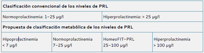En el año 2020 se propuso que los niveles < 7 µg/l se consideren como hipoprolactinemia, por sus implicaciones metabólicas que contribuyen a la generación de hígado graso, función inadecuada de las células beta, tejido adiposo disfuncional y tono hipotalámico dopaminérgico reducido (4, 79); como normoprolactinemia se propusieron valores de 7-25 µg/l y niveles entre 25-100 µg/l para clasificarlos como HomeoFIT-PRL, debido a que es necesario para mantener la homeostasis metabólica y en respuesta a situaciones de estrés como la hipoglucemia, el ejercicio, la excitación sexual, el entrenamiento intensivo o los picos circadianos sin una causa patológica (4), aunque son necesarios más estudios sobre los rangos de HomeoFIT-PRL para dilucidar mejor su impacto sobre el peso corporal, glucosa, insulina y perfil lipídico (64), y la hiperprolactinemia con valores > 100 µg/l, que puede ser debido a alguna patología estructural, metabólica, farmacológica o genética (tabla 2) (4).