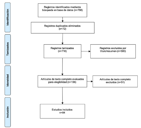 Se realizó tamizaje por título y resumen, y luego por texto completo, y se seleccionaron las publicaciones que abordaran la temática en estudio. Se incluyeron estudios primarios como ensayos clínicos y estudios analíticos, y secundarios tales como revisiones de tema, revisiones sistemáticas, metaanálisis y guías de práctica clínica. Se excluyeron estudios descriptivos, cartas al editor y resúmenes de conferencias o congresos. De este proceso resultaron 84 artículos para la revisión, el proceso de búsqueda y selección de fuentes de información se muestra en un diagrama Prisma (figura 1).