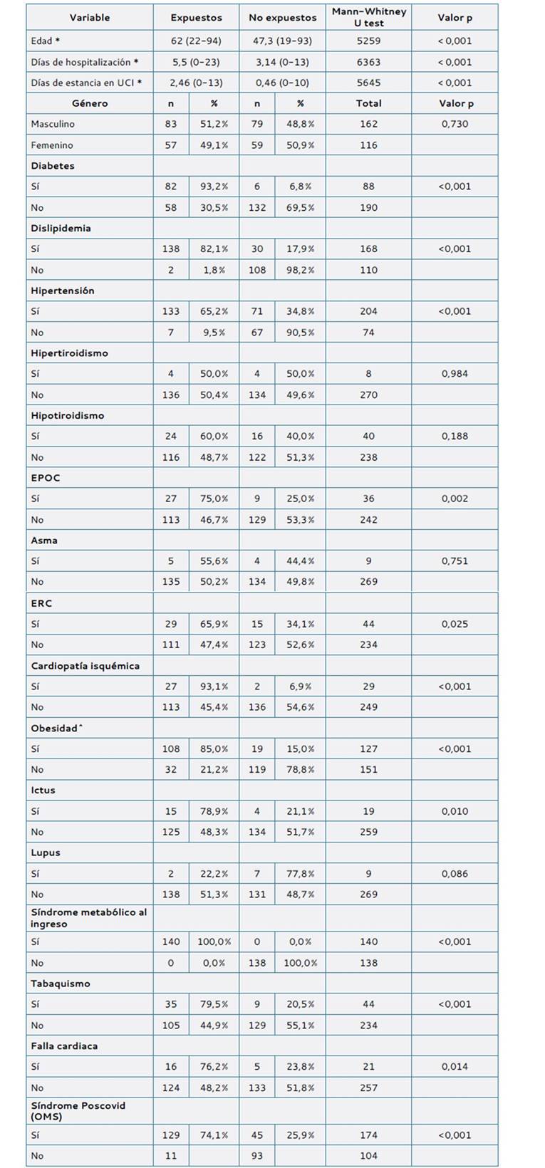 Se analizaron datos de 278 pacientes, de los cuales el 50,4 % (n = 140) estaban en la cohorte de exposición y el 49,6 % en la cohorte no expuesta (n = 138). El 58,3 % de los pacientes (n = 162) fueron hombres, la edad promedio fue de 54,7 ± 18,3 años, teniendo la persona más joven 19 años y la de mayor edad de 94, ME = 56 RIC (40-70). La proporción de personas en la cohorte expuesta y no expuesta fue similar en cuanto al género, presencia de hipertiroidismo, hipotiroidismo, asma y lupus, sin embargo, la edad, los días de hospitalización y los días de estancia en UCI fueron mayores en la cohorte expuesta. En la tabla 1 se presentan las variables clínicas y demográficas de cada una de las cohortes del estudio.