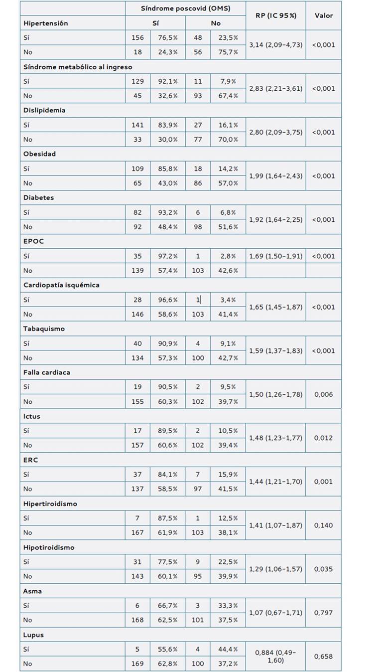 En el análisis bivariado se encontró asociación entre la hipertensión, el síndrome metabólico al ingreso, la dislipidemia, la obesidad, la diabetes, el EPOC, la cardiopatía isquémica, el tabaquismo, la falla cardiaca, el ictus, la ERC y el hipotiroidismo con síndrome poscovid (tabla 3).