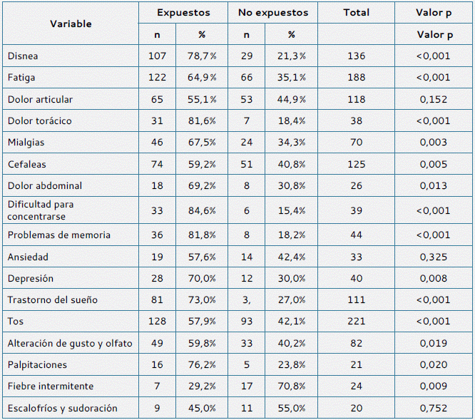 En cuanto a los síntomas del síndrome poscovid, pudimos observar que nuestro estudio refleja los datos descritos en la literatura mundial (24-26); los síntomas referidos de forma más frecuente por los pacientes en la cohorte expuesta fueron: disnea (78,7 %), fatiga (64,9 %), tos (57,9 %) y dolor articular (55,1 %), y en cuanto a síntomas neurológicos y del estado de ánimo, los síntomas referidos en orden de frecuencia fueron: dificultad para concentrarse (84,6 %), trastornos del sueño (73 %), síntomas depresivos (70 %) y síntomas de ansiedad (57,6 %). De forma general, los síntomas del síndrome poscovid tuvieron una mayor frecuencia en la cohorte expuesta, excepto el dolor articular, la ansiedad y la presencia de escalofríos, que fueron similares en ambos grupos, y la fiebre intermitente que, por el contrario, fue más frecuente en la cohorte expuesta. Estos datos hacen pensar que existe una relación directa entre la presencia de diversas comorbilidades y los síntomas persistentes del COVID-19, tal como se ha descrito desde el inicio de la enfermedad, tanto para la fase aguda como para los síntomas a largo plazo.