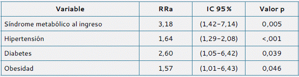: en la cohorte expuesta, el 74,1 % presentó el síndrome poscovid, mientras que en la cohorte no expuesta el 25,9 % presentó dicho desenlace. Luego del análisis multivariado, se estableció una asociación estadísticamente significativa entre el diagnóstico de síndrome metabólico en la fase aguda de la infección por COVID-19 y el desarrollo de síndrome poscovid, con un RRa de 3,18, IC 95 % 1,42-7,14; p = 0,005.