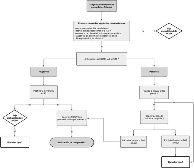 Figura 1. Algoritmo diagnóstico de la MODY: Nota. *:antecedentefamiliar de diabetes en primera línea de consanguinidad en tres generaciones sucesivas o en dos generaciones si uno de los familiares fue diagnosticado antes de los 25 años; °: medición de al menos tres anticuerpos (anti-GAD 65, antiislotes, antiinsulina, ZnT8); †: péptido C medido en el periodo posprandial, idealmente en las siguientes cinco horas posteriores a la ingesta. Se debe realizar, simultáneamente, la medición de glucosa sérica para descartar hipoglucemia y realizar una interpretación adecuada del valor del péptido C, según la glucemia central, considerando que, en hiperglucemia, un péptido C bajo indica deficiencia significativa de insulina endógena. En caso de glucosa sérica menor de 70 mg/dl, se debe repetir el péptido C tomado en condiciones adecuadas.