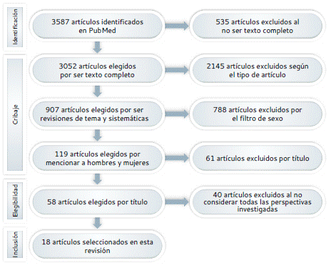 La revisión del presente tema provee un compendio de las investigaciones existentes acerca del COVID-19 y las diferencias por sexo. La estrategia elegida incluyó el uso de los siguientes términos MESH: (“COVID-19” (Mesh) OR “SARS-CoV-2” (Mesh)) AND (“Gonadal Steroid Hormones”(Mesh) OR “Immunity”(Mesh) OR “Angiotensin-Converting Enzyme 2”(Mesh) OR “X Chromosome”(Mesh) OR “Sex Characteristics”(Mesh)), mediante la que se identificaron 3587 artículos disponibles publicados desde diciembre del 2019 hasta mayo del 2021, usando el motor de búsqueda PubMed. Posteriormente, 535 artículos fueron excluidos, pues no estaban disponibles en texto completo libre y gratuito. Del saldo resultante de 3052 artículos, por criterio de los autores, solo se escogieron artículos de revisiones temáticas o revisiones sistemáticas, dejando así 907 artículos, los cuales se filtraron por sexo, permaneciendo solo 119. Prosiguiendo con la fase de elegibilidad, los 119 artículos fueron analizados y evaluados minuciosamente, siendo 18 artículos los incluidos en el presente documento, considerando todas las perspectivas pertinentes para la elaboración de la revisión (figura 2).