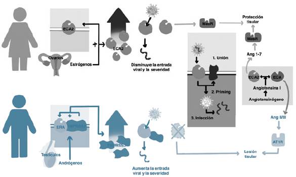 En términos de factores diferenciales endocrinos existe una mayor reserva de ECA2 en mujeres, pues expresan al doble el gen de la ECA2 ubicado en el alosoma X, además poseen una tendencia a presentar polimorfismos y dimerizaciones diversas, lo que dificulta la interacción con el virus. De igual manera, menores valores en mujeres de TMPRSS2, debido a la menor estimulación por andrógenos, dificultan la entrada del virus a la célula.
