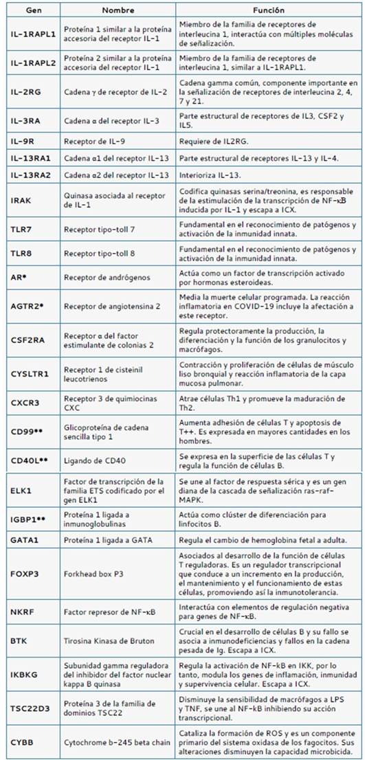 Fuente: elaboración propia. Notas aclaratorias: en la tabla se encuentran diferentes genes codificados en el cromosoma X que son relevantes en la respuesta inmune diferenciada por sexo. (*) Indica genes relacionados con ejes hormonales y (**) indica genes que codifican para clústeres de diferenciación celular.