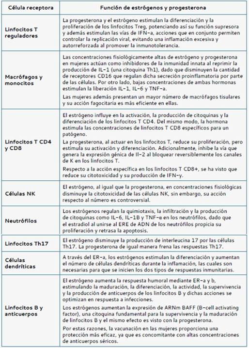 Las hormonas sexuales se ven involucradas en la regulación de múltiples tejidos y sistemas, entre los que se puede destacar el inmune (tabla 2). El contexto hormonal otorga una diferenciación clara entre sexos, dada por concentraciones significativamente mayores de estrógenos y progesterona en las mujeres (40).