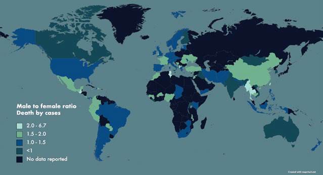Figura 1: Mapa de proporción de muertes por casos de hombres frente a mujeres Notas aclaratorias: se resaltan los países según la razón hombres/mujeres en muertes por COVID-19. Se observa un predominio de la sobrevivencia femenina, donde Santa Lucía, Taiwán, Myanmar, Tailandia, Túnez y Albania resaltan por presentar una razón de menos de la mitad de mortalidad femenina frente a la masculina. Por otro lado, Vietnam, Uganda, India, Iraq, Australia, Corea del Sur y Liberia son contrarias a la tendencia global. Alrededor de 100 países no poseen suficiente información para medir la proporción en el número de muertes disgregado por sexo.