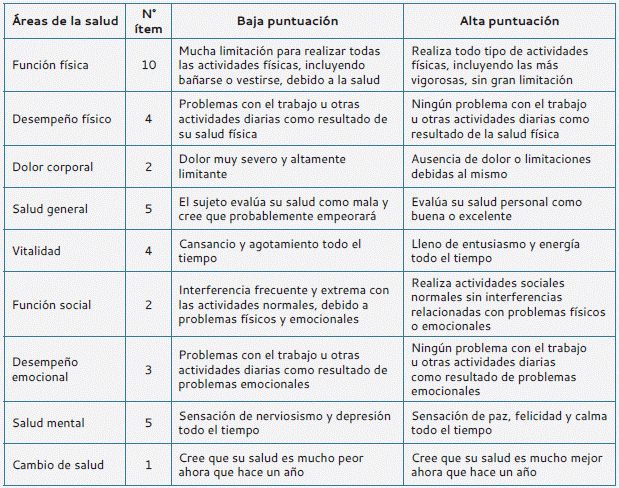 El SF-36 consta de 36 preguntas agrupadas en nueve áreas de la salud (tabla 1): 1) función física, 2) rol físico, 3) dolor corporal, 4) salud general, 5) vitalidad, 6) función social, 7) rol emocional, 8) salud mental y 9) cambio de salud. Las puntuaciones inferiores describen una percepción pobre acerca de la salud, la pérdida de funcionalidad y la presencia de dolor, mientras que las puntuaciones superiores expresan una buena percepción de salud, sin déficit funcional y sin dolor (9).